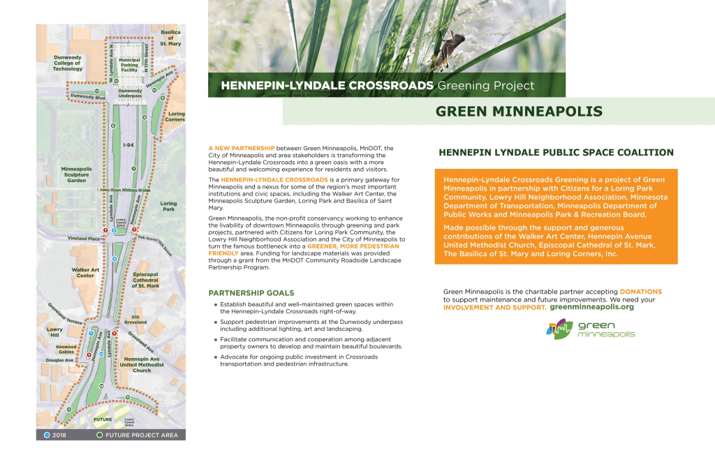 2018 Overview of the Hennepin Lyndale Crossroads Coalition and Greening Project This coalition of Institutions and community members works in partnership with the non-profit organization Green Minneapolis to maintain and improve landscaping at the publicly owned green spaces that run through the center of the corridor.