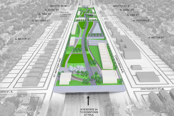 2020 Basilica of St. Mary Masterplan, Urban Design Strategies – Duval Group, HGA, Ten x Ten ‘Long Term Strategy’ – “When the freeway segment abutting the Basilica ages out, it should be removed, and the I-94 tunnel should be extended, enabling the freeway to move through the district beneath the ground. Achieving that goal will require constituency, and an adopted plan recommending the viaduct’s removal and providing justification. That adopted plan must then be championed as City by the City of Minneapolis.” See Document